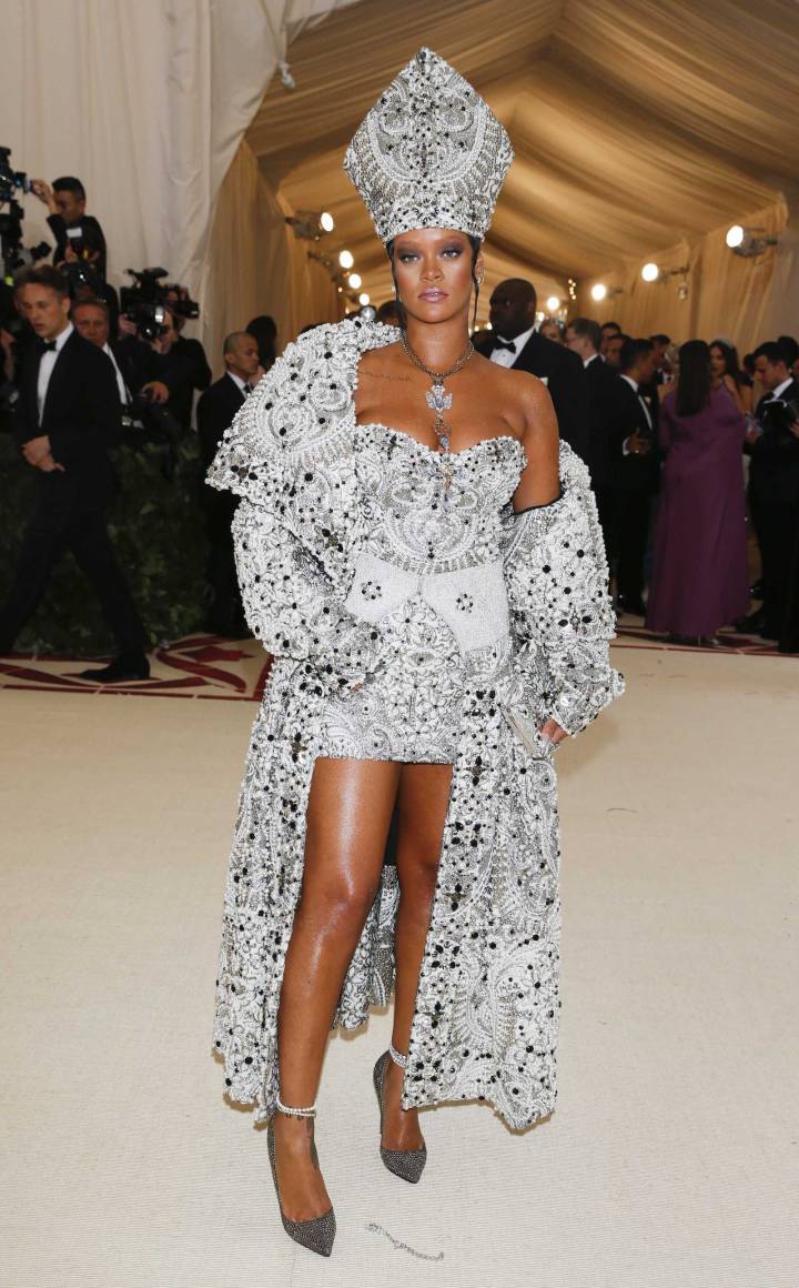 La nostalgia —y la mitomanía— fue la inspiración de Donatella Versace, que apareció con un mullet dress que recordaba al que usó en 1993 en esta misma gala, cuando Vogue celebraba un siglo de vida. Un vestido del que se habla en la serie El Asesinato de Gianni Versace. Rihanna tardo más en aparecer. Rihanna necesitaba público para lucir su espectacular traje de inspiración papal (mitra incluida), creado por Maison Margiela y cuajado por completo de perlas, uno de los adornos más utilizados durante el Renacimiento por la realeza. Fue la papisa del evento.