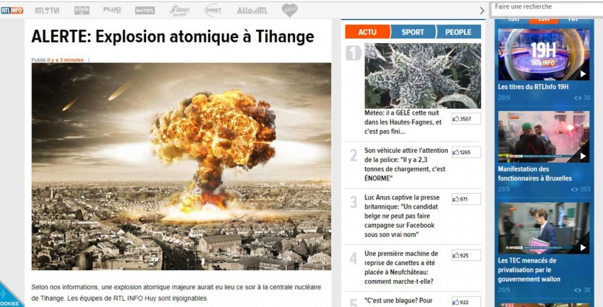 En esta última categoría entra el bulo difundido este viernes en Bélgica. Numerosos ciudadanos marcaron el número 112 de emergencias o directamente escaparon en sus vehículos al leer en lo que creían la web de la televisión RTL un titular: "ALERTA: Explosión atómica en Tihange". Esas cinco palabras, acompañadas de la imagen de una deflagración, bastaron para sembrar el terror. Se les escapaba un detalle: la página web era solo una imitación bastante creíble, pero no correspondía en realidad a RTL.